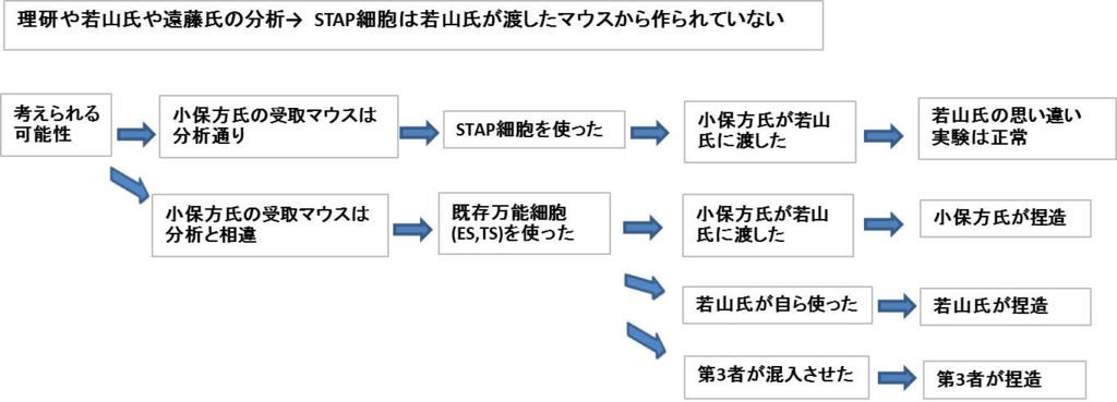 常識的に偏見無しに、この若山氏が突き当たった疑問を公平に考えてみると、下の模式図の原因系が想定されるはずで、いきなり、小保方氏のせいにするのは著しく不当である。